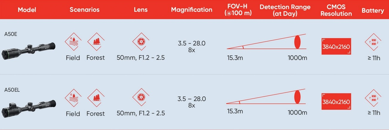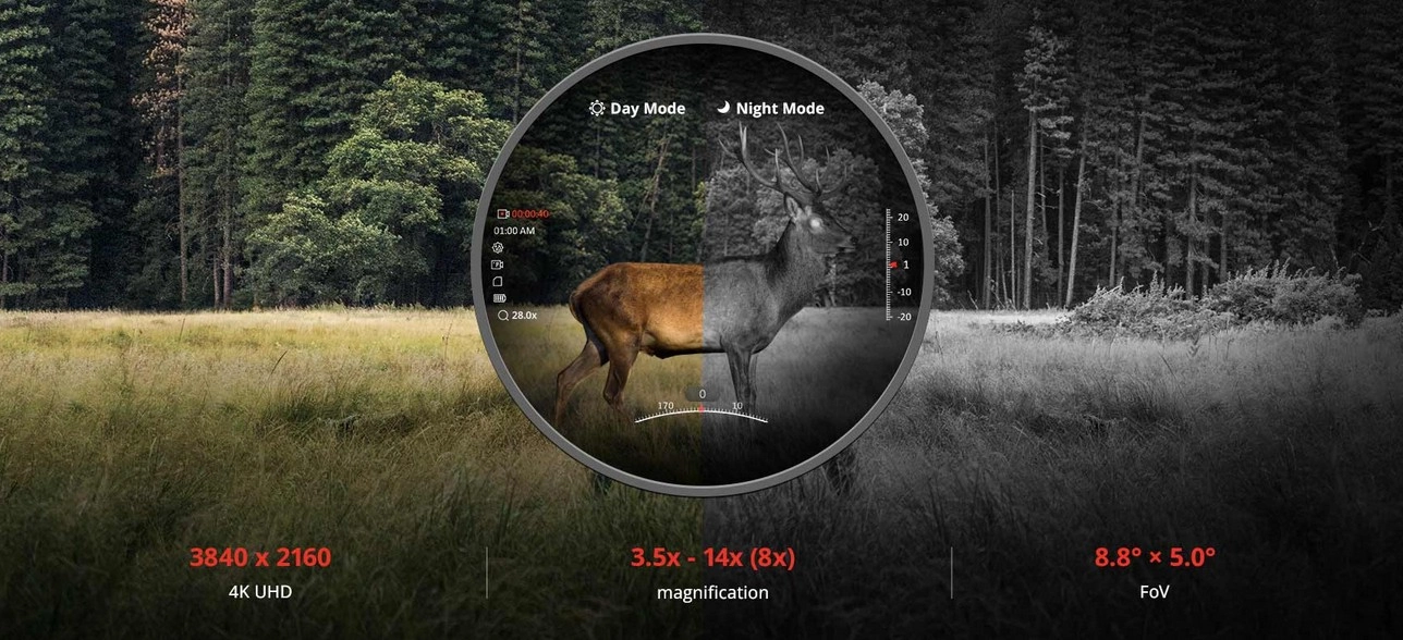 HIKMICRO ALPEX 4K został wyposażony w czujnik CMOS o ultrawysokiej rozdzielczości 3840 x 2160, co zapewnia oszałamiające i niespotykane dotąd szczegóły 24 godziny na dobę. Dzięki podstawowemu 3,5-krotnemu przybliżeniu i polu widzenia wynoszącego 15,3 metra na 100 metrów, wykazuje wyróżniające się zdolności do wykrywania i identyfikacji celów w całym zakresie powiększenia.