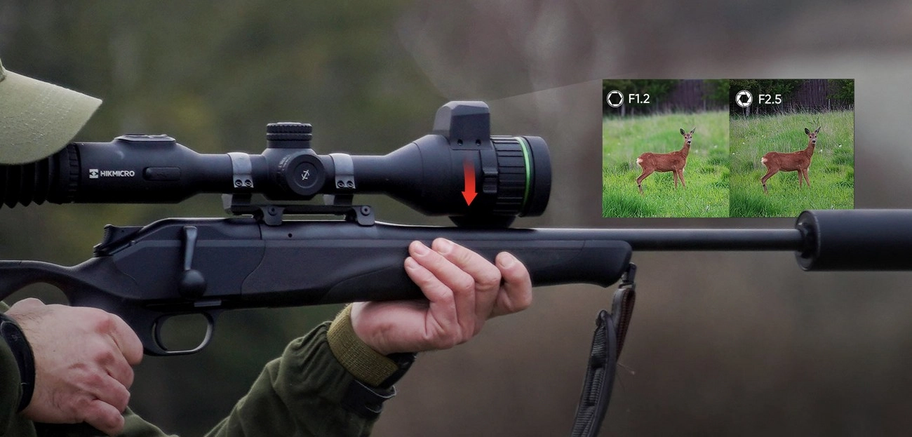 Regulowana przysłona F1.2-2.5 HIKMICRO ALPEX 4X poprawia rozpoznawalność celu w każdych warunkach oświetleniowych. Wprowadzenie dużej przysłony F2.5 może skutecznie pomóc w uniknięciu efektu prześwietlenia i zwiększyć głębie ostrości, co jest wizualną rewolucją nawet podczas polowania w ciągu dnia.