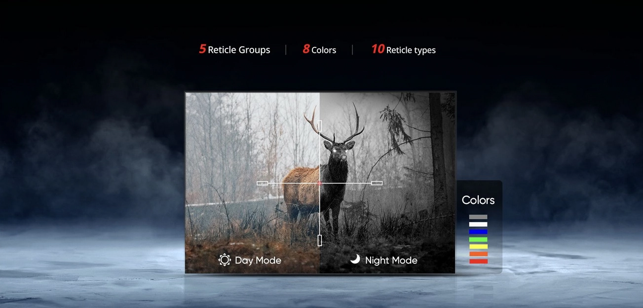 Istnieje 5 grup siatek celowniczych z 8 kolorami i 10 typów siatek celowniczych do wyboru w HIKMICRO ALPEX 4K. W celu zapewnienia większej wygody możliwe jest skonfigurowanie i zapisanie 5 profili siatki celowniczej.