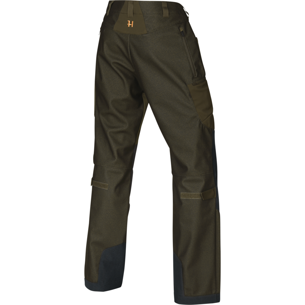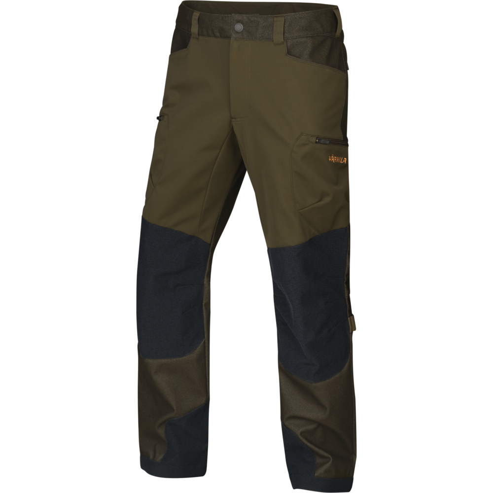 Spodnie hybrydowe Mountain Hunter mają aktywny krój i są wykonane z oddychającego materiału ArcStretch®. Są wodoodporne na całej długości z tyłu i na dolnej części nogi z przodu, a także posiadają zintegrowaną membranę HSP® Härkila Storm Pro, dzięki czemu są oddychające i wiatroodporne. Spodnie są również poddane obróbce DWR, aby odpychać wodę i brud, oraz wzmocnione wyjątkowo wytrzymałym materiałem na kolanach i kostkach. Spodnie mają dwie otwarte przednie kieszenie i dwie zapinane na zamek kieszenie na udach. Prawa kieszeń na udzie zawiera uchwyt na cztery naboje. Spodnie mają również podwójne zatrzaski, zamki wentylacyjne na górnych tylnych udach i paski regulacyjne za kolanami i kostkami.
